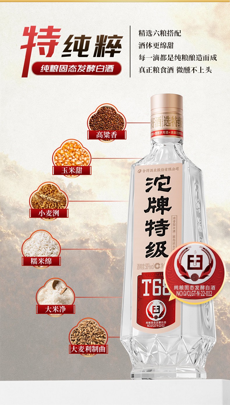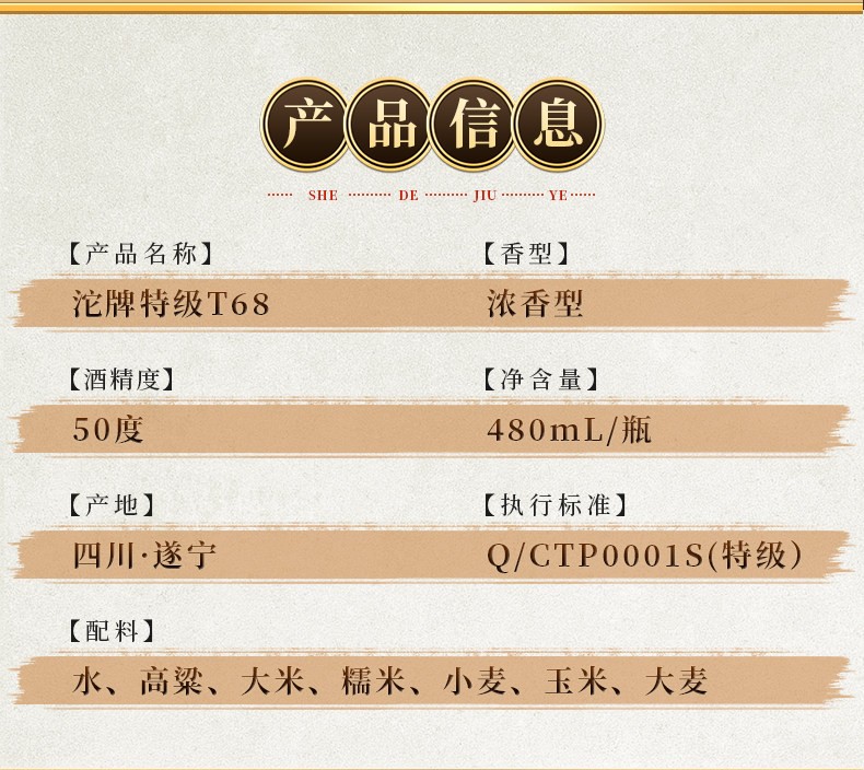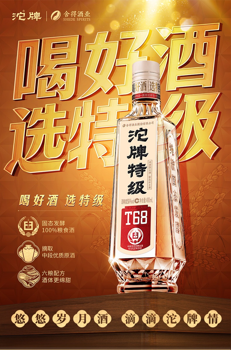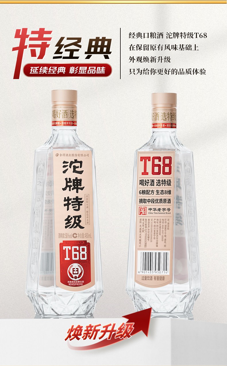 沱牌特级T68升级版浓香型白酒50度480ml光瓶